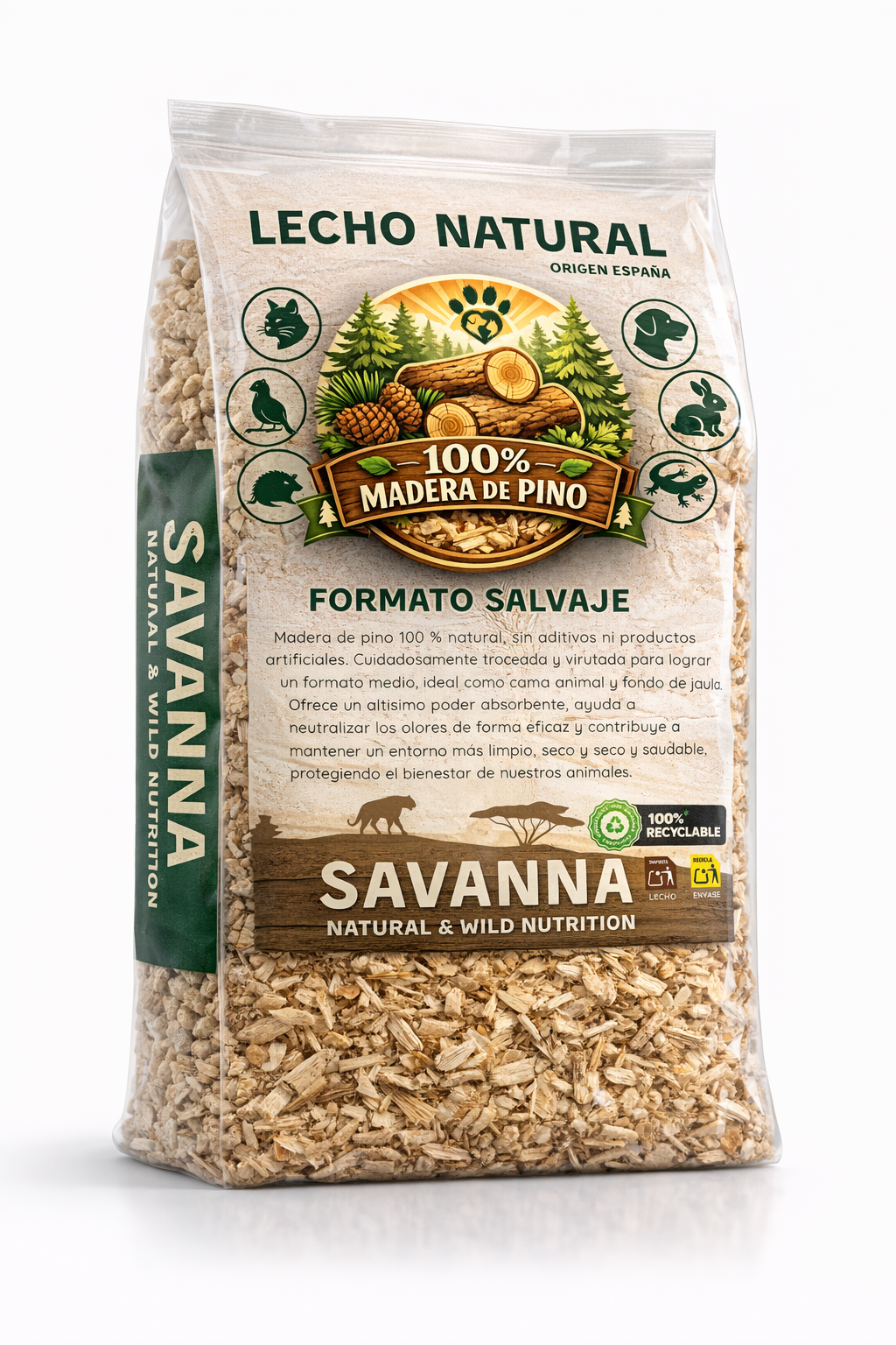 Madera de pino 100% natural, troceada y virutada para obtener un lecho higiénico, absorbente y transpirable, que puede renovarse con solo removerlo y así reutilizar hasta una saturación tras muchos usos.